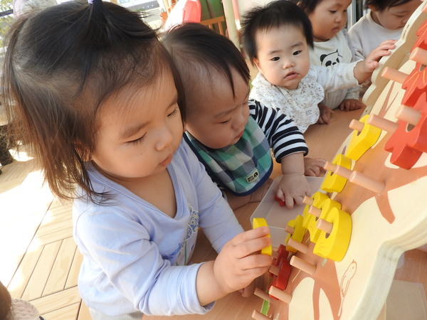 他にも木製遊具のカタカタと鳴り落ちる遊具を目で追ったり、遊具をつまんでまた繰り返し遊んだり、指先を使って集中して満足そうですよ!