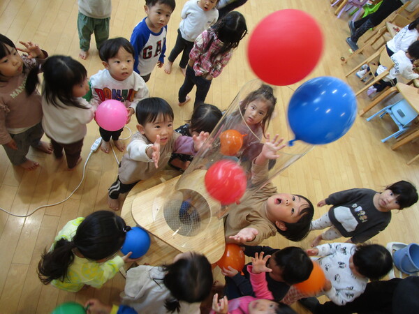 風船を下から通して…3,2,1!ふわ〜っと浮く様にみんなびっくり☆彡