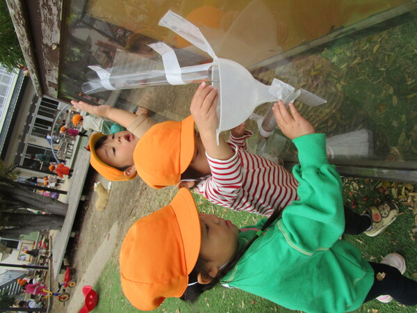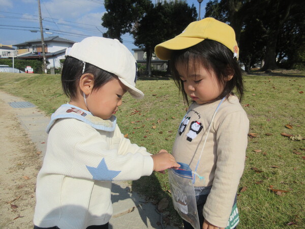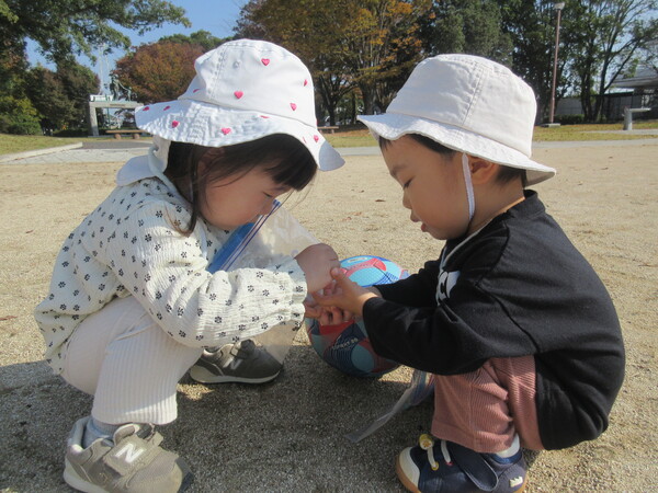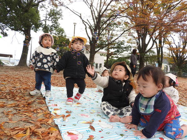 一緒にどんぐりを探したりシャボン玉を追いかけたりと異年齢児で関わりながら活動を楽しみました。