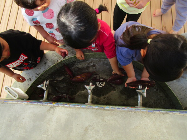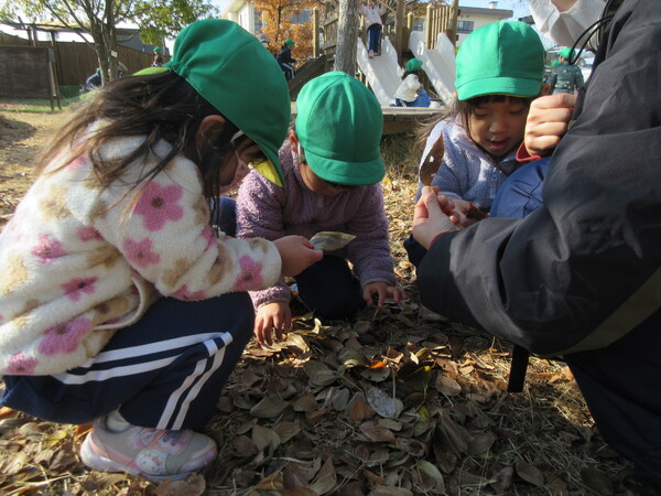 落ち葉も増えてきて、落ち葉を魚や、穴を3つあけオバケに見立て遊ぶ姿が。