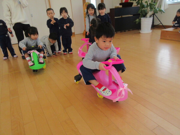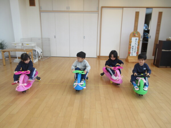 先日、クリスマス会でサンタさんからもも組はバイクをプレゼントで頂きました!