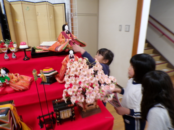 2棟の雛飾りは三段。「三人官女はどこ?」「五人囃子はいないの?」など、さくらぐみならではの会話をしながら楽しんで飾っていましたよ♪
