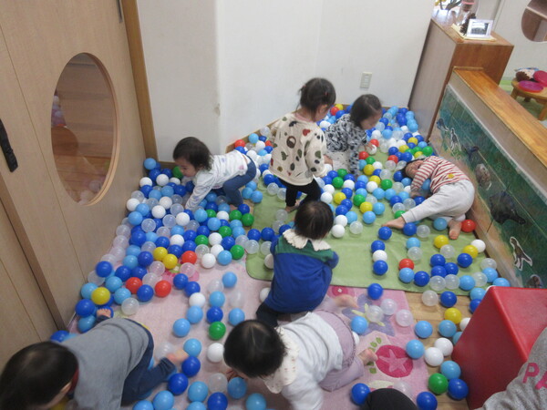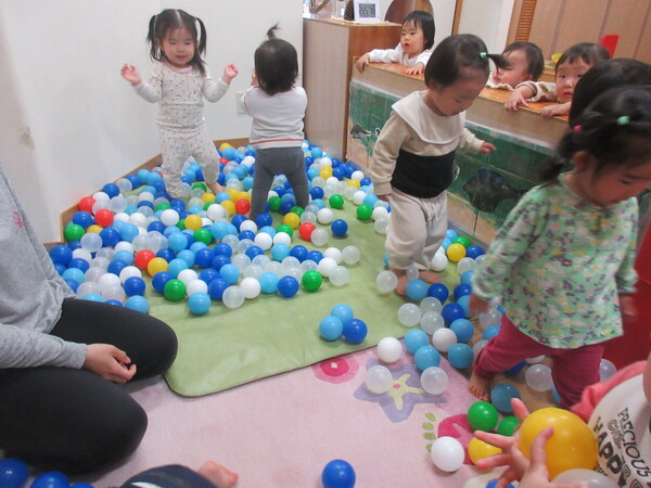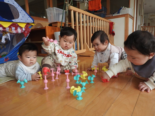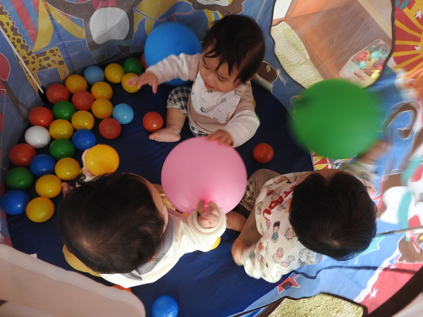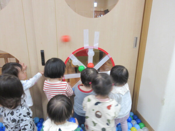 風船が触ると動いて跳ねる様子、ボールが転がる様子、吸盤で引っ付き外れる瞬間、毎日すべてのことが新しい発見と気づきでいっぱいです^^