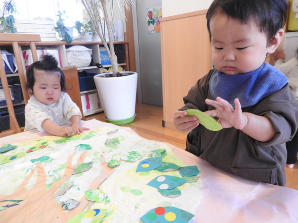 小さなかわいい指先でシールを指さしたり、「ペタ!」と言いながら紙に作品を貼ろうとしたり!
