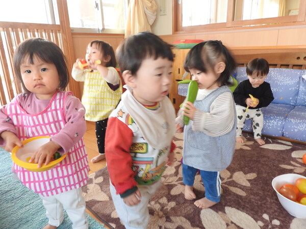 保育者も交えて「どうぞ」「ありがとう」のやり取りを楽しみながら、