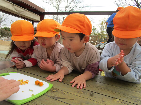 果樹園になっているキンカンを発見!どんな味なのか興味津々の子どもたちでした😊