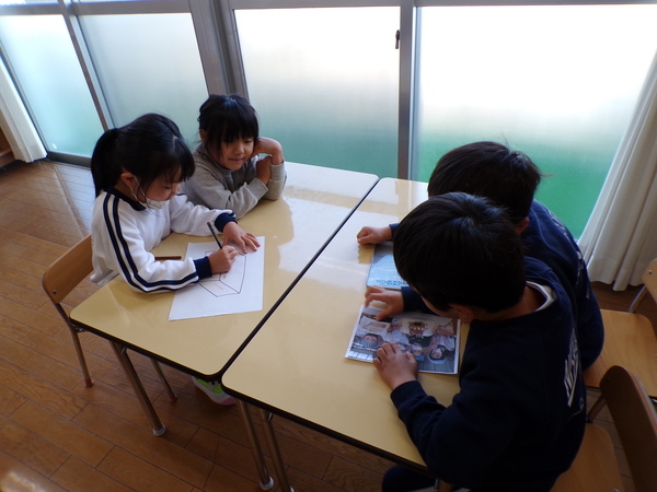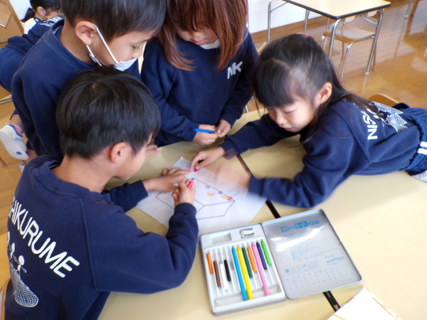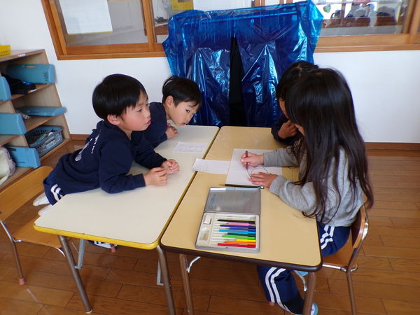 スポンジの形やクリームの種類、トッピングに何を乗せるかを各グループで話し合い、絵をかいています。