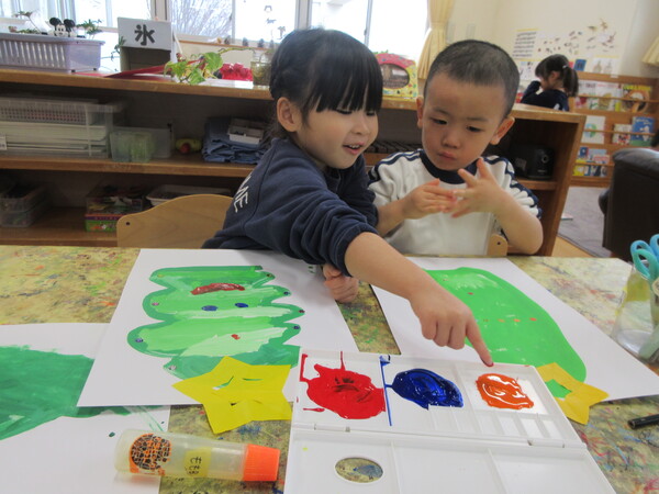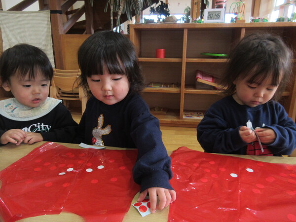 きくぐみではクリスマスの準備が着々と進んでいます^^カラーポリ袋に丸シールを貼って模様付け♡指先を使って台紙からはがし、思い思いにシールを貼っていましたよ!!クリスマス会のときに着用する予定です♡室内は手作りツリーやリース、オーナメントでにぎやかになっています!!クリスマスが待ち遠しい子どもたちです♡