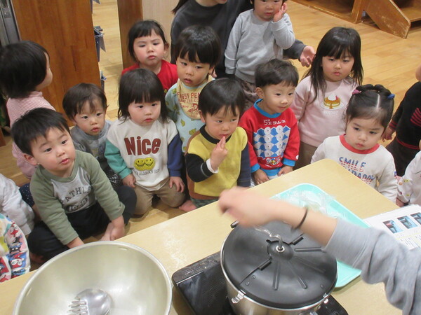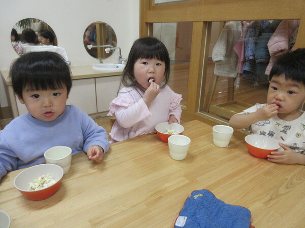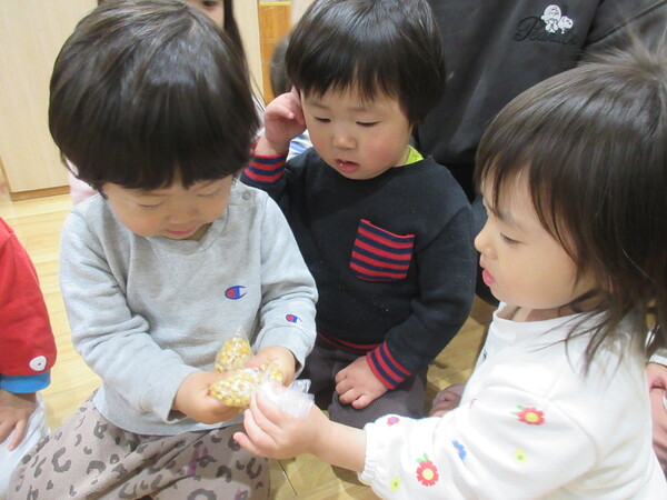 ポップコーンの豆を触ったり、匂いを嗅いだり、出来上がる様子を楽しみました。