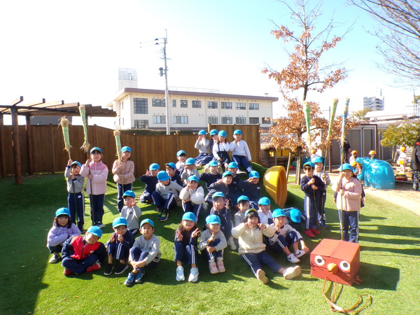 1/14(水)にもぐら打ちを行いました。土の中にいるもぐらを追い払い、野菜や穀物の豊作を祈る行事で、さくら組がわらで地面を叩き、うめ組がモグラ役。