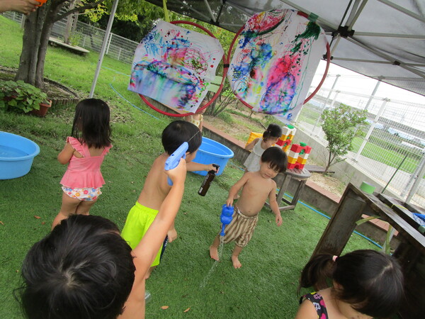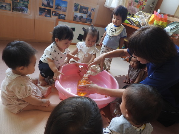 今週まで楽しんだ水遊び!最終日は色水作り→色水遊びをして盛り上がりました。4色の水じ〜っと眺めて、出来上がった後はテラスで色を混ぜてみて…またまた興味津々でしたよ!