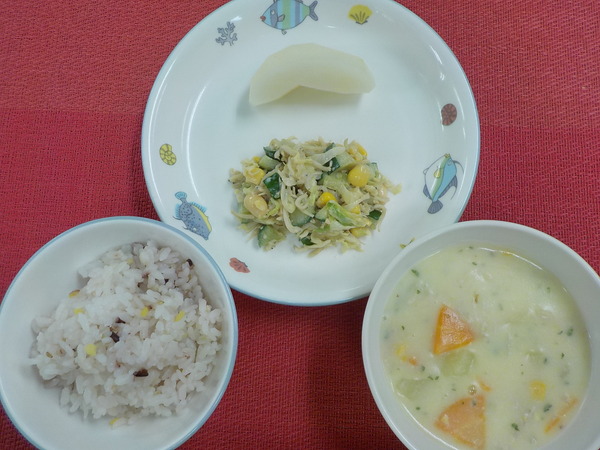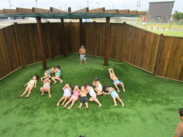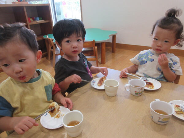 実習に来ていた大学生と一緒に流しそうめんで、夏ならではの「食」を楽しみました。流れてくるそうめんをフォークを使って取るのに最初は、「難しい」「取れない」と言っていた子どもたちも、少しずつコツをつかみ、「取れたー!」と嬉しそうな表情でそうめんを食べる姿が見られました。