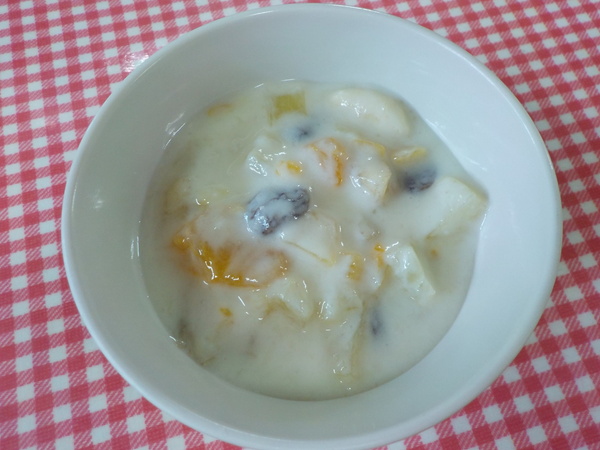 食育(クッキング)でお好みホットを食べました!お好みホットの具材はコーン、ベーコン、キャベツ、もやしが入っていて、