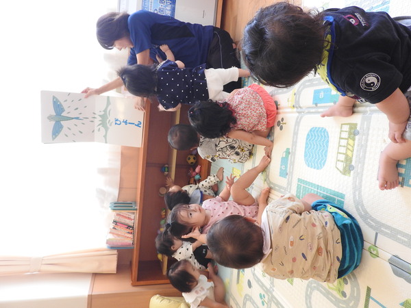 大型絵本はみんな大好き!いろいろな生き物が動く様子を保育教諭が「ぴょ〜ん」と真似すると拍手で応えて、反応がはっきりしてきて成長を感じます!
