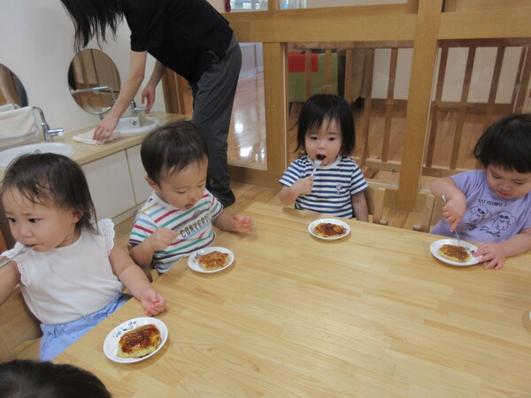 粉がホットケーキの粉を使っているのでほんのり甘いお好み焼きのような味ですよ😊子どもたちに人気でおかわりをたくさんしていました!!