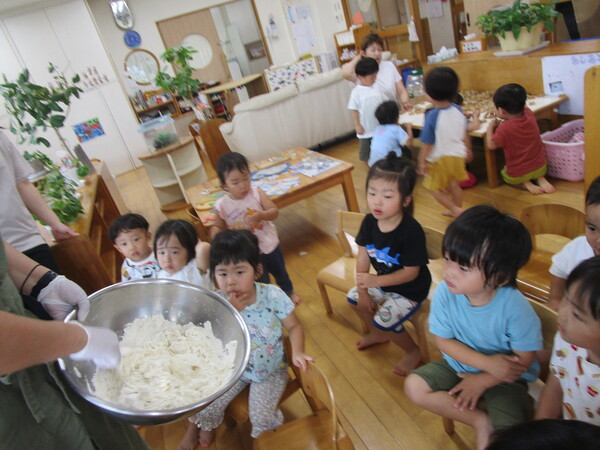今日は食育の一環で、2歳児ばら組でも楽しく出来る、うどん作り😊