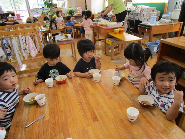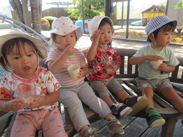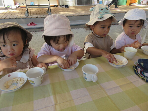 朝の体操が終わって中庭へレッツゴー!!10時のおやつは中庭で♡外の風を浴びながら食べるおやつは格別のようでした♡おやつを食べてエネルギーチャージをしたあとは、中庭や虹森、運動場で元気いっぱい遊んでいます!!