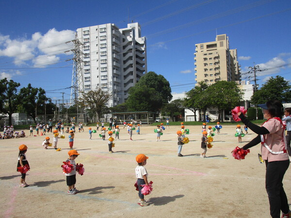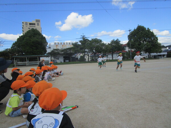 秋晴れというより夏に戻ったような陽気の中、園舎となりの北川原公園で運動会を行いました。