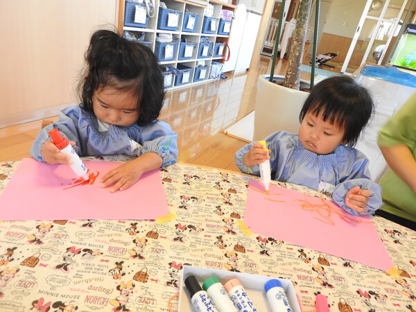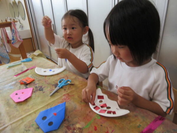 ハロウィンの制作ではさみで切って、貼って折り紙を折って仮面づくりを行ったり